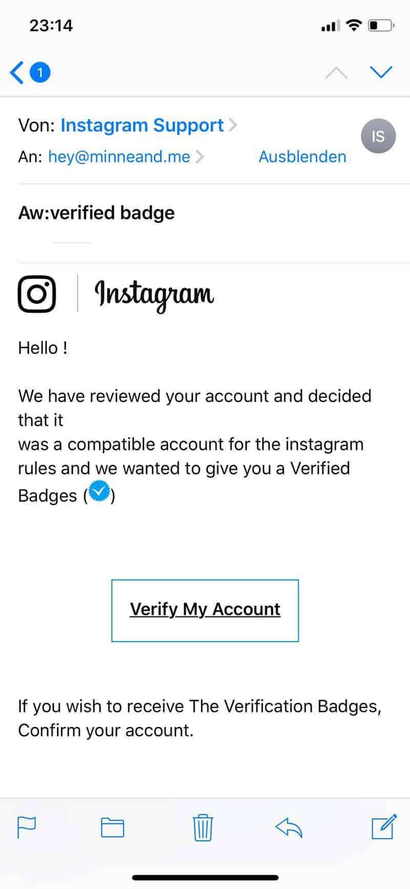 Erst vor einigen Monaten bekam ich eine E-Mail von Instagram – vermeintlich – und sie schrieben mir, unser Account minneandme sei für den blauen Haken ausgewählt worden und ich müsse mich nur noch flink verifizieren.